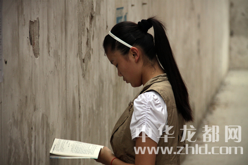 開考前一名女學(xué)生還在溫習(xí)課文。