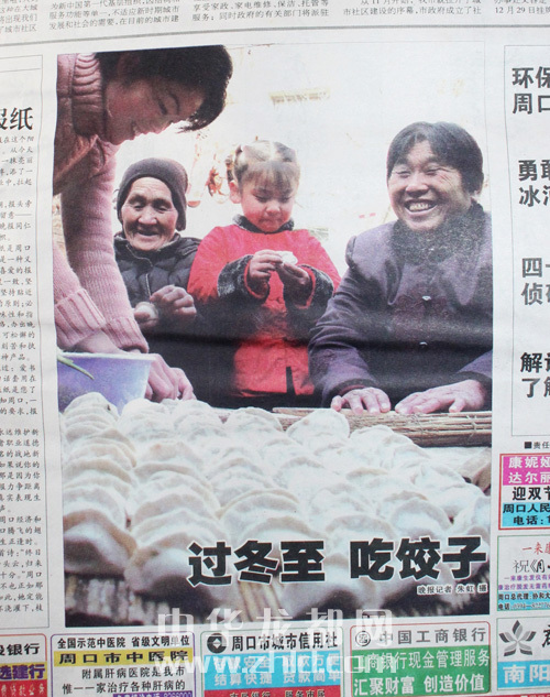 ????創(chuàng)刊號頭版壓軸圖片《過冬至,吃餃子》,拍攝的是80多歲的姥姥、50多歲的媽媽、30多歲的媳婦、五六歲的小女孩四世同堂歡天喜地包餃子的場景。媳婦搟餃子皮,姥姥、媽媽包餃子,五六歲的小女孩也來湊熱鬧,拿起一個餃子皮學著大人的模樣包餃子,剛剛包好的一大鍋蓋餃子令人垂涎。特別是按照晚報的送報時間,創(chuàng)刊號報紙送到千家萬戶時正好是上午11時之前,此時正是人們包好餃子準備煮餃子的時間??上攵蠹乙贿吰纷x屬于周口人自己的晚報、欣賞和諧家庭歡天喜地包餃子的圖片,一邊把包好的餃子下到沸騰的開水鍋里,那煮出的餃子香味和著晚報濃濃的墨香,香飄滿城,沁人心脾。