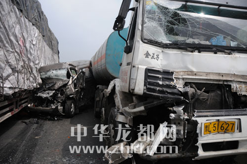 ????現(xiàn)場(chǎng),20多輛汽車駕駛室嚴(yán)重變形。一輛懸掛晉M牌照拉木材的貨車的駕駛室被撞成一團(tuán),方向盤甩在4米外的路面上。約2公里長(zhǎng)的地面上散落了不少貨物、車窗碎片及大片機(jī)油。