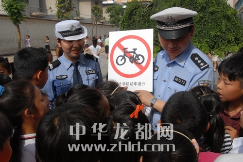 為學(xué)生們講解道路交通識別牌。