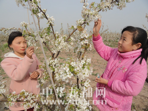 ???????4月12日,商水縣舒莊鄉(xiāng)北王張村的小學(xué)生在自家的梨園為梨花授粉。星期天,該村的小學(xué)生紛紛跑到梨園欣賞盛開(kāi)的梨花,幫助家長(zhǎng)為梨花授粉,享受著在梨花中勞動(dòng)的樂(lè)趣。