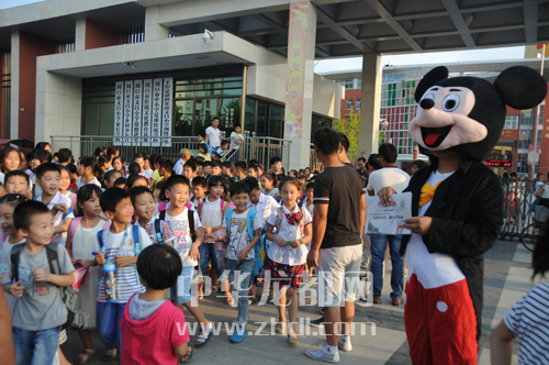 ????9月1日17時(shí)許,在慶豐路周口市文昌小學(xué)門前,家長們看到周口晚報(bào)工作人員在派發(fā)禮品,紛紛掏出手機(jī),掃描二維碼關(guān)注周口晚報(bào)微信公眾號(圖一)。17時(shí)40分,放學(xué)的孩子們排著整齊的隊(duì)伍陸續(xù)走出校門。校門外,由周口晚報(bào)記者扮演的米老鼠和唐老鴨“大玩偶”吸引了孩子們的目光(圖二)。孩子們興奮地同“大玩偶”玩耍起來。有玩的,還能免費(fèi)領(lǐng)取學(xué)習(xí)用品,孩子們大聲召喚家長加入到掃描二維碼關(guān)注周口晚報(bào)微信公眾號的“大軍”中來。市民趙先生說:“我是咱晚報(bào)的忠實(shí)讀者,正準(zhǔn)備訂閱明年的報(bào)紙,還打算讓孩子參加晚報(bào)組織的小記者活動呢!”