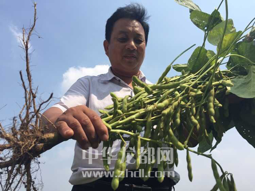 ??? 圖③ 9月25日,在西華縣逍遙鎮(zhèn)全國種糧大戶曹自堂的試驗基地,曹自堂看著試種的大豆新品種喜出望外。記者 張猛 攝