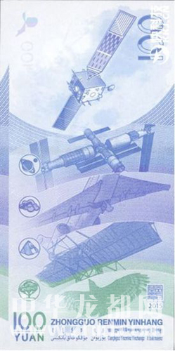 中國航天紀(jì)念鈔面額為100元,票面長155毫米,票面寬77毫米,中國航天紀(jì)念鈔主色調(diào)為藍(lán)色。正面主景圖案為神舟九號(hào)飛船與天宮一號(hào)交會(huì)對(duì)接圖案。左上方為國徽?qǐng)D案、“中國人民銀行”行名,其下方為東方紅一號(hào)衛(wèi)星圖案。票面左下方為面額數(shù)字“100”和漢字“壹佰圓”。主景圖案右側(cè)為嫦娥一號(hào)衛(wèi)星圖案,其上方為面額數(shù)字“100”和“中國航天紀(jì)念”字樣。背面主景圖案由上至下依次為嫦娥一號(hào)衛(wèi)星圖案、2020年中國空間站“天宮”、噴氣式客機(jī)、馮如2號(hào)雙翼螺旋槳飛機(jī)、飛禽海東青圖案。票面左上角為風(fēng)箏局部圖案,右上角為面額數(shù)字“100”。票面下方為行長章與年號(hào)“2015”,中國人民銀行漢語拼音字母和蒙、藏、維、壯四種民族文字的“中國人民銀行”字樣與面額,面額數(shù)字“100”,漢語拼音字母“YUAN”。