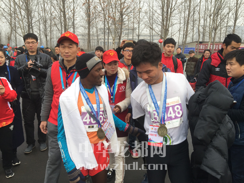 ????經(jīng)過(guò)激烈角逐,21歲的小伙子李鴻浩以1小時(shí)12分56秒奪得了男子半程馬拉松第一名,張妮以1小時(shí)24分57秒奪得女子組冠軍。全程馬拉松男、女冠軍分別被來(lái)自埃塞爾比亞的兩位選手Bekele和Meskerm·Gutu·Tola以2小時(shí)16分40秒和2小時(shí)44分43秒奪得。