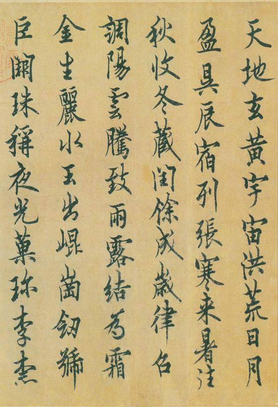 ????《千字文》全書共250句。每四字一句,四句一組,兩組一韻,前后貫通,互不重復(fù)。其內(nèi)容涉及天文、地理、歷史、農(nóng)工、園藝、飲食起居、修身養(yǎng)性及封建綱常禮教等各個(gè)方面。包羅萬象,涵蓋面廣泛,其最大優(yōu)點(diǎn)又在于融知識(shí)性、可讀性和教化性為一爐,誦讀一遍即感到文采斐然,合轍押韻,瑯瑯上口,易誦易記,梁武帝讀后,龍顏大悅,興奮不已。立即命令刻印,作為“諸王”的習(xí)誦課本,并刊諸于世,為初學(xué)者入門教本。從此,不僅中國帝王之家有了一本集識(shí)字、書法和思想內(nèi)容為一體的啟蒙讀物,而且中國社會(huì)乃至世界教育史上也有了問世最早、流傳最久、影響最大的蒙學(xué)教材。