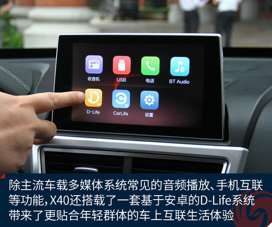 不過跟奔騰X40接觸兩天之后,會發(fā)現(xiàn)它大可不必在對手林立的市場中血拼顏值,靠實力不俗的獨(dú)門絕技一樣能夠輕松獲得一席之地。既然面向年輕用戶,豐富的車載娛樂系統(tǒng)很關(guān)鍵。大屏幕、手機(jī)互聯(lián)等等似乎已經(jīng)是這類車的標(biāo)配。奔騰X40更進(jìn)一步,所搭載的D-Life系統(tǒng)讓我們看到了它引領(lǐng)潮流的勁頭。