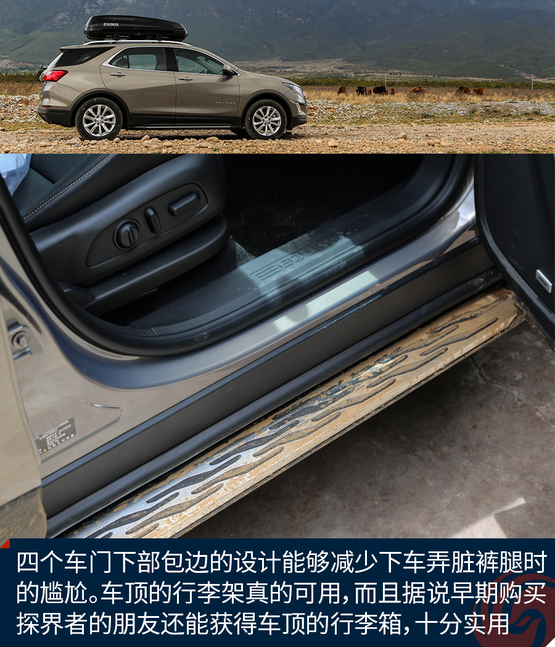 外觀上令我印象深刻的地方有這么幾個(gè),首先前后燈組都運(yùn)用了大量的LED光源,不過(guò)稍顯遺憾的是,沒(méi)有全部都采用LED,我猜在探界者中期改款的時(shí)候會(huì)有所改變。四個(gè)車門下部包邊的設(shè)計(jì)能夠減少下車弄臟褲腿時(shí)的尷尬。車頂?shù)男欣罴苷娴目捎?,而且?jù)說(shuō)早期購(gòu)買探界者的朋友還能獲得車頂?shù)男欣钕?,十分?shí)用。雙出的排氣看上去很有氣勢(shì),而探界者身上的這個(gè)鯊魚鰭天線應(yīng)該是我見過(guò)最粗壯的了。車輪的造型十分動(dòng)感,而且尺寸也是兼顧了SUV應(yīng)有的實(shí)用性。