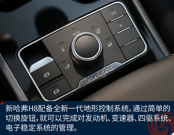 ????????四驅(qū)系統(tǒng)也是新哈弗H8的亮點,搭載全新一代全地形控制系統(tǒng),可使駕駛者簡單的旋轉(zhuǎn)旋鈕,切換駕駛模式,這套系統(tǒng)集成了7大不同的駕駛模式。讓駕駛者可以輕松面對各種復(fù)雜的路況,這套系統(tǒng)的目的就是把復(fù)雜的操作簡單化。