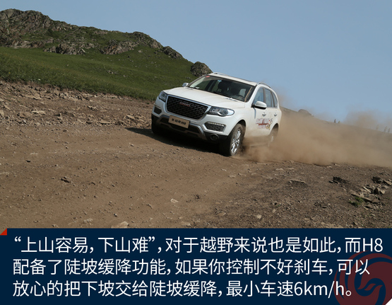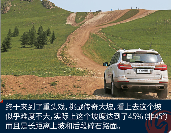 ????????經(jīng)過刺激的涉水越野,我們終于來到了此行最難的挑戰(zhàn)地,傳奇大坡。這條上山的土路從圖片上看起來不陡,實際上已經(jīng)達到了45%的坡度。人爬起來都氣喘吁吁。而且難度大的原因是兩點,一個是超長距離的大上坡,另一個是后端是碎石路面。你想靠沖坡根本行不通,如果動力不足最終是無法登頂?shù)?。H8不僅動力充沛而且有4L,低速四驅(qū)模式,而且博格華納雙速TOD可以隨時分配動力傳遞到前后軸,保障了有抓地力的輪胎有驅(qū)動力。