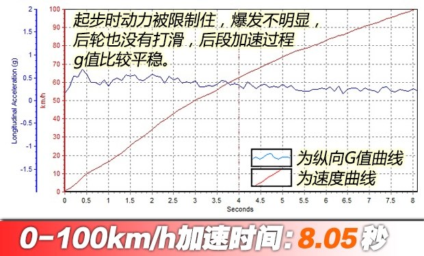 ????雖然可以關(guān)閉穩(wěn)定系統(tǒng),但感覺卻對(duì)發(fā)動(dòng)機(jī)輸出非常保守,變速箱也不允許拉到很高的轉(zhuǎn)速。起步后車輪沒有明顯滑動(dòng),說明并沒有達(dá)到最佳輸出狀態(tài),最終成績(jī)?yōu)?.05秒,成績(jī)與老款車型有差距,略有遺憾。