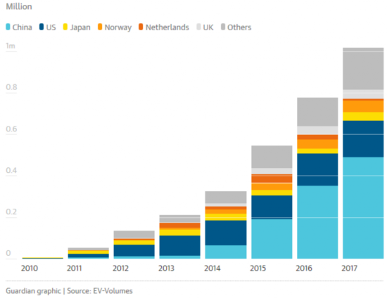 經(jīng)證實,至2017年11月底,全球電動汽車保有量已超過300萬輛。2017年前11個月電動汽車銷量超過100萬。