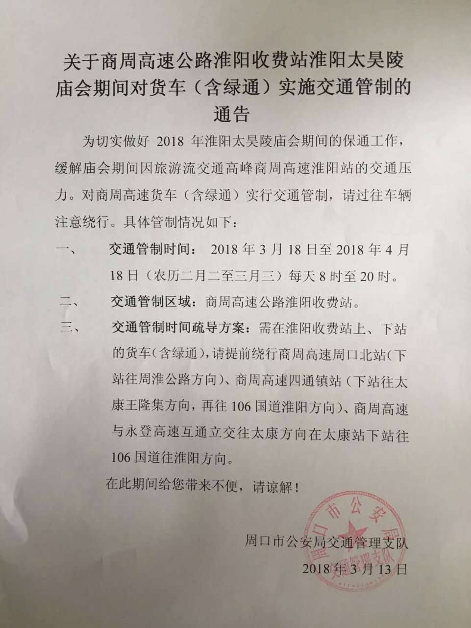 中華龍都網(wǎng)訊(周口報(bào)業(yè)全媒體記者 侯俊豫)3月13日,市交警支隊(duì)發(fā)布通告稱(chēng),為做好2018年太昊陵廟會(huì)期間的保通工作,緩解廟會(huì)期間商周高速淮陽(yáng)站的交通壓力。對(duì)商周高速貨車(chē)(含綠通)實(shí)行交通管制,請(qǐng)過(guò)往車(chē)輛注意繞行?,F(xiàn)對(duì)商周高速貨車(chē)(含綠通)實(shí)行交通管制: