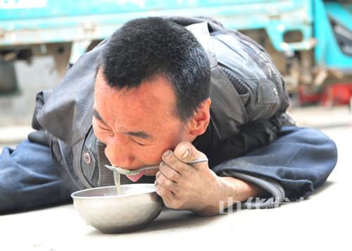媽媽乘上一碗放在地上,紅印坐在墊子上,用腳夾著勺子,彎下腰來吃得很香??吹郊t印吃飯那么費(fèi)力,在場人心里酸酸的,為紅印自強(qiáng)不息所打動(dòng)著??墒钱?dāng)初娘倆可沒少流眼淚,李新蘭發(fā)現(xiàn)兒子兩只腳是靈活完好的,就開始訓(xùn)練他用腳吃飯、洗臉。養(yǎng)大一個(gè)正常的孩子尚且不易,何況是張紅印這樣的孩子?李新蘭一遍遍地教,年幼的張紅印一遍遍地學(xué)。難為到受不了時(shí),娘倆就抱在一起哭。