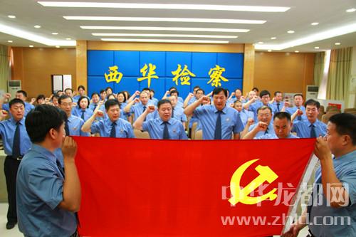 中華龍都網(wǎng)訊(周口報(bào)業(yè)全媒體記者 竇娜 通訊員 屈琳琳)“我志愿加入中國(guó)共產(chǎn)黨,擁護(hù)黨的綱領(lǐng),遵守黨的章程,履行黨員義務(wù),執(zhí)行黨的決定……”6月28日,面對(duì)鮮紅的黨旗,西華縣人民檢察院副檢察長(zhǎng)、黨支部書記劉新建帶領(lǐng)全體黨員高舉右手,重溫入黨誓詞。
