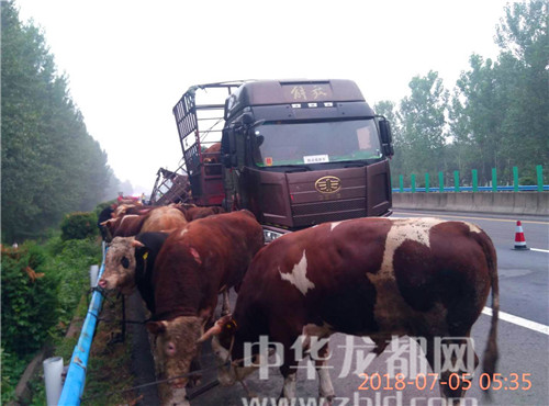 中華龍都網(wǎng)訊(周口報業(yè)全媒體記者 姬慧洋 通訊員 劉杰 文/圖)“在大廣高速2025公里西半幅附近發(fā)生一起單方事故,幾十頭牛散落在路面,請求處警?!?月5日5時許,周口市公安局交通管理支隊高速二大隊扶溝中隊接到110指令稱。