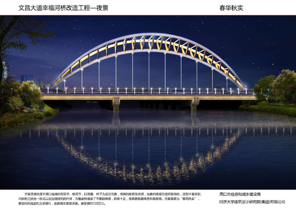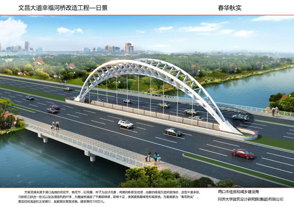 周口大道沙潁河橋景觀改造,設(shè)計(jì)造型簡(jiǎn)單柔美,如行云流水,同時(shí)與沙潁河景觀帶相融合,給城市增添了生機(jī)與活力。周口大道賈東干渠橋以荷葉為設(shè)計(jì)元素,造型簡(jiǎn)約而不失細(xì)節(jié)。周口大道流沙河橋造型簡(jiǎn)潔大氣,線條流暢,像一條青龍游弋在水面上。文昌大道幸福河橋以花瓣、葉子為設(shè)計(jì)元素,造型豐富多彩。文昌大道流沙河故道橋在中分帶位置修建花壇,花壇造型莊重古樸,景石造型端莊沉穩(wěn)。太清路流沙河橋以古建斗拱、窗花為元素,造型儒雅大方。太清路洼沖溝2號(hào)橋以“輻轂相依”為名,既融合環(huán)境,又有團(tuán)結(jié)、合作的寓意。太清路賈魯河橋,增加了景觀造型,使人們可以重溫當(dāng)年賈魯河的美好畫卷。彭新莊橋以柳葉為元素,預(yù)示著留住賓客與送別親友的不舍之情的雙重含義。