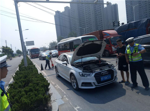 8月26日中午11點(diǎn),周口港區(qū)公安分局民警發(fā)現(xiàn),一輛私家車行經(jīng)周項(xiàng)路周口港區(qū)路段時(shí),發(fā)生故障停在快車道,影響道路暢通。港區(qū)交警部門負(fù)責(zé)人姜亞偉上前了解情況,得知汽車電瓶出現(xiàn)故障,無法正常發(fā)動(dòng)。于是姜亞偉將警車開到私家車旁,用汽車電瓶連接線將警車電池與私家車鏈接,幫助車主啟動(dòng)汽車,迅速恢復(fù)道路交通秩序。