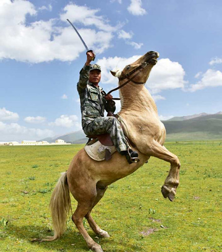 “一開始就‘認慫’,哪還有一點騎兵精神可言?!壁w雪超暗自打氣。打那以后,趙雪超像根上緊的發(fā)條,和戰(zhàn)馬較上了勁。他晚上練劈刺,白天練馬術動作,被馬一次次地摔下去,他拍掉身上的塵土又一次次地躍上馬背……就是憑借這股不服輸?shù)捻g勁, 3個月后,趙雪超的訓練成績在連隊名列前茅。