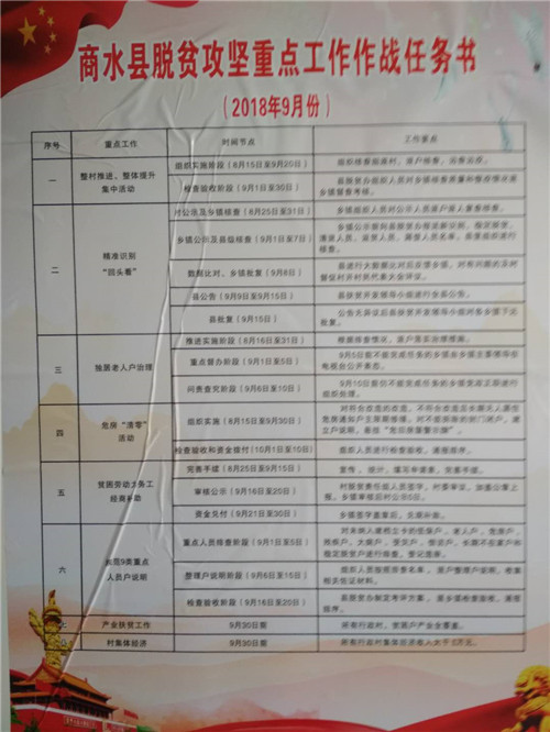 “‘脫貧攻堅(jiān)重點(diǎn)工作作戰(zhàn)任務(wù)書’既是作戰(zhàn)圖、也是軍令狀,每個(gè)時(shí)間點(diǎn)開展哪些工作、達(dá)到什么效果、采取何種措施,都在‘作戰(zhàn)任務(wù)書’上顯現(xiàn)了出來?!?月5日上午,商水縣練集鎮(zhèn)朱集村脫貧責(zé)任組組長(zhǎng)陳書敬指著張貼在村辦公室內(nèi)的“商水縣脫貧攻堅(jiān)重點(diǎn)工作作戰(zhàn)任務(wù)書”說。