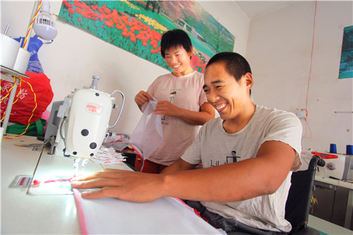 生意閑的時(shí)候,朱建舟又和妻子商量,借錢購買了兩臺(tái)縫紉機(jī),幫助附近一家工廠加工環(huán)保袋。加工活雖然不累,但對(duì)于雙腿殘疾的朱建舟來說卻很困難。一向愛動(dòng)腦筋的朱建舟自己動(dòng)手把縫紉機(jī)踏板改裝成手動(dòng)式的,大大提高了工作效率。“一個(gè)月能掙2000多元錢,還能顧家,照顧病人和孩子?!蓖跷迥菪睦镉姓f不出的高興。