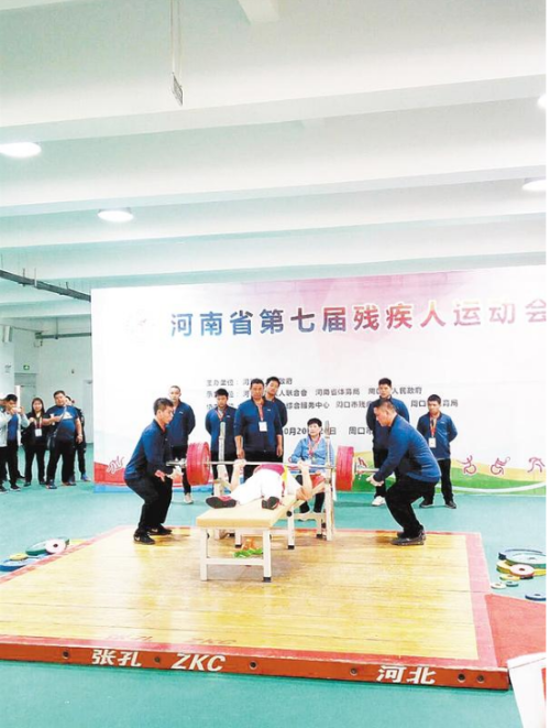 10月24日下午,在河南省第七屆殘疾人運(yùn)動(dòng)會(huì)男子舉重65公斤級(jí)比賽中,南陽選手范天增以185公斤的成績強(qiáng)勢(shì)奪冠,遠(yuǎn)高于第二名信陽選手湯孝虎95公斤的成績。②8記者 張志新 攝