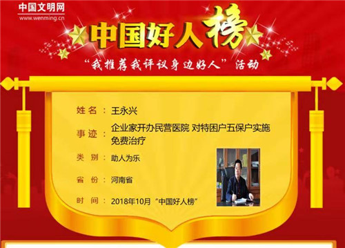 太康縣農(nóng)家出身的王永興熱心公益,累計(jì)投資高達(dá)數(shù)千萬(wàn)元。10月31日上午,10月中國(guó)好人榜發(fā)布儀式暨全國(guó)道德模范與身邊好人現(xiàn)場(chǎng)交流活動(dòng)在江蘇連云港舉行,太康縣王永興榮登10月份助人為樂(lè)類“中國(guó)好人榜”。據(jù)悉,太康縣入選“中國(guó)好人榜”人數(shù)已達(dá)42人。