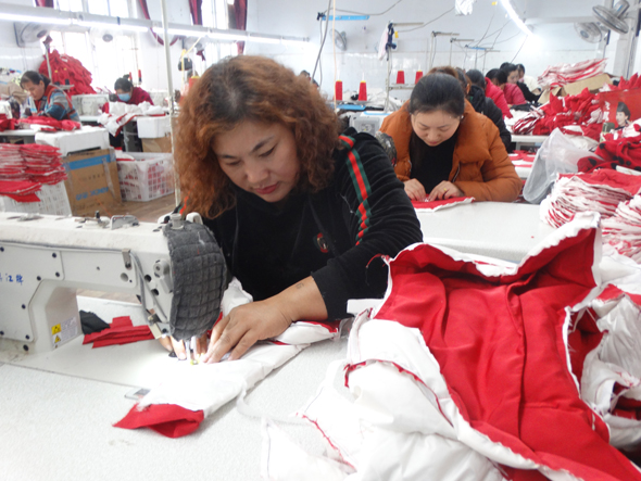 11月11日,沈丘縣周營(yíng)鎮(zhèn)慧恩服飾來(lái)料加工點(diǎn),當(dāng)?shù)厥畮酌羰亍扒上眿D”正忙著加工訂單兒童冬季服裝。