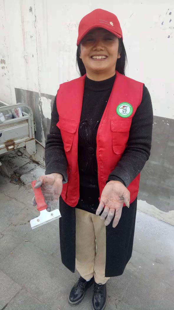 周口市啄木鳥志愿者服務(wù)工作委員會(huì)臨時(shí)黨支部書記、周口市慈孝文化促進(jìn)會(huì)會(huì)長(zhǎng)孫彩云更是不怕臟,不怕累,連個(gè)手套都不帶,直接用雙手拿著鏟刀或者抹布清理墻上的小廣告,最后弄得雙手和滿身都是污漬?!盀榱宋覀兊某鞘懈?,作為一名志愿者,就應(yīng)該不怕累,不怕苦?!?/p>