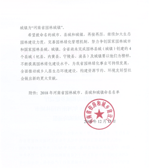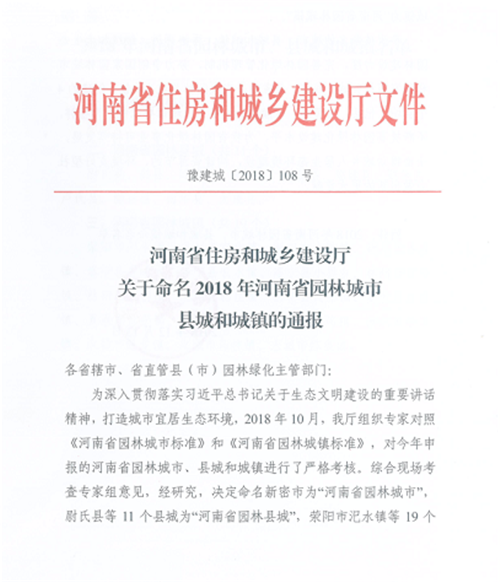其中,新密市1地被命名為河南省園林城市,太康縣、西華縣、尉氏、淇縣、延津縣、原陽(yáng)縣等11個(gè)縣被命名為河南省園林城市,登封市宜化鎮(zhèn)、新密市大隗鎮(zhèn)、新鄭市薛店鎮(zhèn)等19個(gè)鄉(xiāng)鎮(zhèn)被評(píng)為河南省園林城鎮(zhèn)。