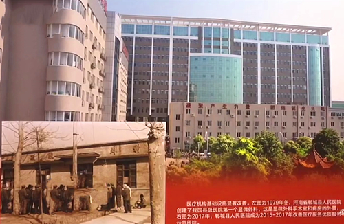 河南電視臺(tái)記者陳貞君在展覽板前介紹,這里是位于第四展區(qū)的兩幅同一所醫(yī)院的照片——河南省鄲城縣人民醫(yī)院,這張是1979年冬天,鄲城縣人民醫(yī)院創(chuàng)建了我國(guó)縣級(jí)醫(yī)院第一個(gè)顯微外科,這就是當(dāng)時(shí)的顯微外科的手術(shù)室和病房的外景,這張是2017年的鄲城縣人民醫(yī)院??梢哉f(shuō)改革開放讓同一所醫(yī)院有了滄海桑田般的變遷。