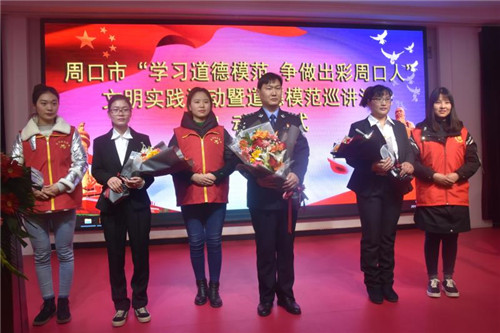 市公安局交警王凱偉是2018年敬業(yè)奉獻(xiàn)類中國好人,省五四獎(jiǎng)?wù)芦@得者,經(jīng)常參加公益活動(dòng),持續(xù)幫助貧困女孩小夢麗和她家人,用善舉挽救了這個(gè)貧困家庭。扶溝縣曹里鄉(xiāng)刁灣小學(xué)教師李艷琴扎根鄉(xiāng)村教育一線無怨無悔,數(shù)年如一日照顧癱瘓?jiān)诖驳钠牌湃蝿谌卧?,曾獲縣最美鄉(xiāng)村老師稱號(hào)。鹿邑伯陽中學(xué)“90后”女教師劉交交剛參加完高考后父親因病去世,母親身患?xì)埣?。她不向命運(yùn)低頭,靠打工收入和微薄的助學(xué)金維持生活和學(xué)業(yè),為照顧母親,她攜母上大學(xué),曾獲中國大學(xué)生自強(qiáng)之星等稱號(hào),被授予省五四獎(jiǎng)?wù)?。三位道德模范雖然都是最平凡的人,但都有一顆不平凡的心,他們的感人事跡散發(fā)著奪目的光芒,深深感染了現(xiàn)場的每一位聽眾,不少人流下了感動(dòng)的淚水。