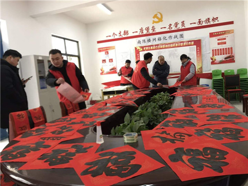 臨近新春佳節(jié),淮陽(yáng)縣多家單位邀請(qǐng)書法家深入結(jié)對(duì)幫扶村開展新春送"福"到農(nóng)家送春聯(lián)活動(dòng),一幅幅春聯(lián)翰墨飄香,讓群眾贊不絕口,一幅幅春聯(lián)送去新春的祝福,讓原本寒風(fēng)凌冽的冬日變得溫馨、喜慶。圖為縣住建局組織書法愛(ài)好志愿者在朱集鄉(xiāng)南陳樓開展送春聯(lián)活動(dòng),志愿者現(xiàn)場(chǎng)揮毫潑墨,書寫新春對(duì)聯(lián),受到廣大群眾的歡迎。