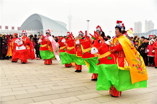 展演現(xiàn)場,人頭攢動,鑼鼓喧囂,16名身穿金黃、亮藍衣服的舞龍隊員率先登場,金燦燦的巨龍時而甩尾前行,時而昂首盤踞,浩浩蕩蕩;8只舞獅歡騰雀躍、活靈活現(xiàn);精美的裝飾的旱船穿行其中,老生、老旦扮相的隊員邊走邊唱;整齊劃一的腰鼓隊以及隊形優(yōu)美的擔經挑把現(xiàn)場氣氛推向高潮……持續(xù)近2小時的展演活動中,精彩的民俗表演令人目不暇接,為這座城市增添了濃濃的年味。