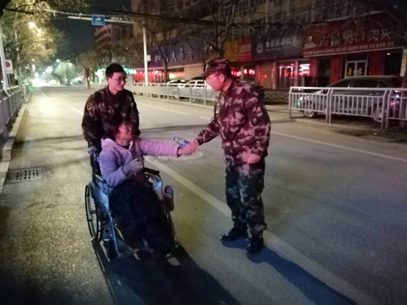 人民軍隊(duì)愛人民,無(wú)論山高水遠(yuǎn),歲暮天寒。2月18日凌晨1時(shí)許,武警周口支隊(duì)政委韓偉鋒查勤歸來(lái),在支隊(duì)大門口恰巧遇到一位大姐獨(dú)自一人搖著輪椅艱難前行。當(dāng)晚氣象局預(yù)報(bào)有降雪,實(shí)時(shí)氣溫也只有-4℃。夜深人靜,天凝地閉,韓政委有些擔(dān)憂這位大姐的安全,連忙上前詢問情況,并步行推著輪椅將大姐送至目的地。其實(shí),這件事只是武警周口支隊(duì)愛民助民工作的一個(gè)縮影。
