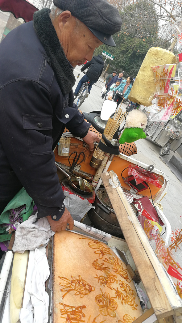 以糖稀為原料制作一幅糖畫,只需要1分多鐘。昨日,記者在中心城區(qū)七一路與六一路交叉口附近,目睹了閆先生制作糖畫的過(guò)程。閆先生以糖稀為原料制作的小動(dòng)物惟妙惟肖,還有“?!薄皭?ài)”等字。閆先生告訴記者,他是周口本地人,制作糖畫已30多年。記者 關(guān)秋麗 攝