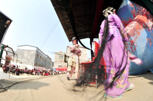 當(dāng)天上午,劇團(tuán)演出的是豫劇《金殿認(rèn)子》,演員們長年在基層演出,練就一身硬功夫。演員們在農(nóng)院內(nèi)化妝,戲服一換,就迅速入戲,生旦凈丑,你來我往,頗見功底的唱腔及其悠長的韻味,讓戲迷們看得入迷。