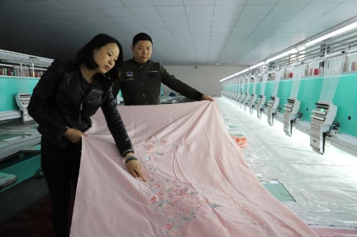 同時,城郊鄉(xiāng)發(fā)揮基層黨員干部和在外創(chuàng)業(yè)成功人士的廣泛人脈資源和經(jīng)濟優(yōu)勢,引導社會投資發(fā)展產(chǎn)業(yè)助力脫貧攻堅。谷集行政村美紡科技有限公司就是典型個例。石永紅、石永華、石磊姐弟3人來自江蘇南通,他們盯上了城郊鄉(xiāng)的富余勞動力,投資800萬元建設了近2000平方米的紡繡車間,20臺國內(nèi)先進設備可以利用全電腦操作繡出12種顏色的繡品。車間固定用工34人,其中建檔立卡貧困戶2人。只需要看著電腦控制臺、換布貼布、穿針引線,每人每天工資便可達到150元。