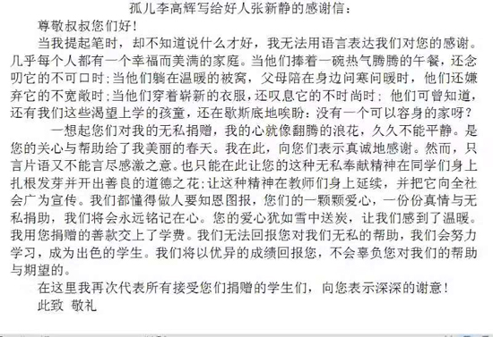 為表示對(duì)張新靜等人大代表的感謝,隨后,李高輝給張新靜寫了一封感謝信。信中,他表示,自己一定不辜負(fù)大家的期望,以后會(huì)更加努力學(xué)習(xí),回饋社會(huì),回報(bào)大家?!八且粋€(gè)懂得感恩的孩子,讀了他的來信,我感到很欣慰。”張新靜說。