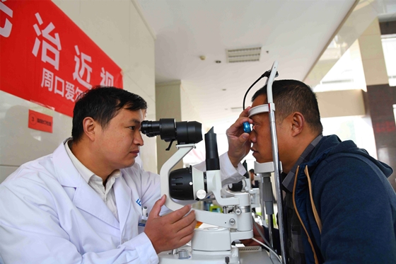 11月8日是記者節(jié)。為了讓奔波在新聞戰(zhàn)線(xiàn),熬夜趕稿、組版的編輯記者眼睛更健康,11月5日,周口愛(ài)爾眼科醫(yī)院的醫(yī)生將儀器搬到周口報(bào)業(yè)傳媒集團(tuán),現(xiàn)場(chǎng)為編輯記者檢查眼睛,關(guān)愛(ài)新聞工作者的身心健康。圖為眼科醫(yī)生為記者檢查視力、實(shí)施治療。記者 劉俊濤 梁照曾 攝