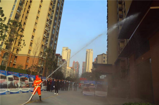 記者在現(xiàn)場看到,隨著消防警鈴的響起、煙霧的彌漫,來自物業(yè)公司和社區(qū)的數(shù)十名群眾彎著腰,同時用濕毛巾捂著口鼻,緊急而有序地從步梯撤出,與此同時,消防隊員迅速將消防水袋和槍頭同消防栓相連接,并打開消防栓對準(zhǔn)“火勢”,一瞬間,發(fā)生在建業(yè)社區(qū)的一場“火災(zāi)”被及時撲滅,現(xiàn)場圍觀的眾人爆發(fā)出陣陣掌聲。