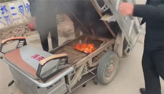 “當(dāng)時(shí)在我們前方的一輛電動(dòng)三輪車駕駛座下冒出黑煙,車上兩位老人察覺到危險(xiǎn)后,急忙下車,站在一旁不知所措。我們也緊跟上前。事發(fā)突然,現(xiàn)場(chǎng)沒有滅火器和可利用水源,而三輪車的火越來越大,兩位老人著急萬(wàn)分,在旁邊不停地請(qǐng)求我們幫幫她們。根據(jù)經(jīng)驗(yàn),我們當(dāng)機(jī)立斷利用路邊的泥土進(jìn)行撲救,經(jīng)過幾十秒的緊張撲救,著火部位被成功撲滅?!比幌狸?duì)員回憶說三輪車是電線短路引起的電瓶著火。