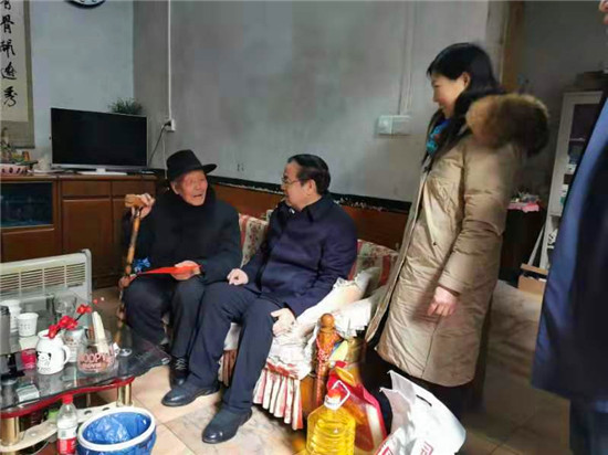 在鹿邑縣中心敬老院娛樂室內,劉國連、胡軍與老人一一握手,向老人們詢問吃的好不好、住的暖不暖、年貨全不全。同時叮囑養(yǎng)老院負責人要照顧好老人們,讓他們過上一個歡樂祥和的春節(jié)。