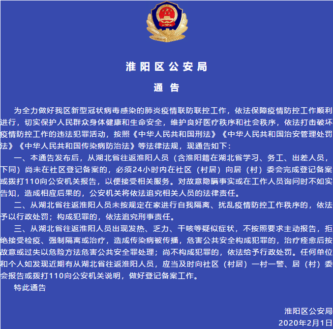 今天,淮陽區(qū)公安局發(fā)通告:從湖北返淮人員務(wù)必24小時(shí)內(nèi)……