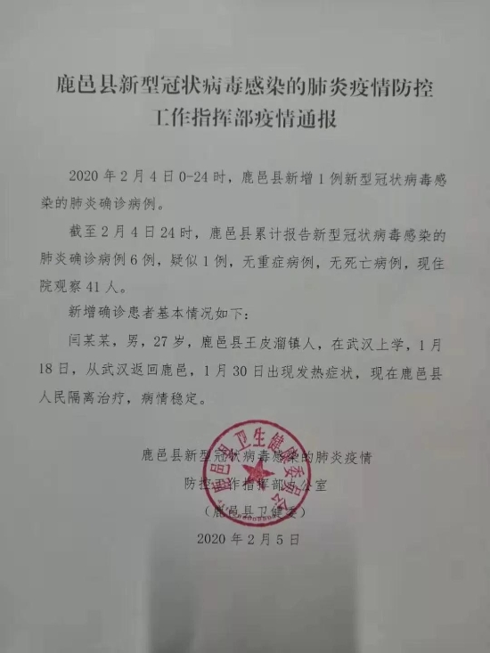 截至2月4日24時(shí),鹿邑縣累計(jì)報(bào)告新型冠狀病毒感染的肺炎確診病例6例,疑似1例,無(wú)重癥病例,無(wú)死亡病例,現(xiàn)住院觀察41人。