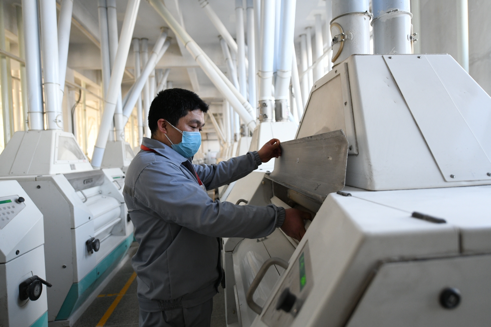 昨日,在五得利集團周口面粉有限公司的生產(chǎn)車間內(nèi),記者看到,工人們戴著口罩緊張有序地忙碌著。該企業(yè)于2月2日全面復(fù)工,目前日處理小麥3000噸、生產(chǎn)面粉2300噸。
