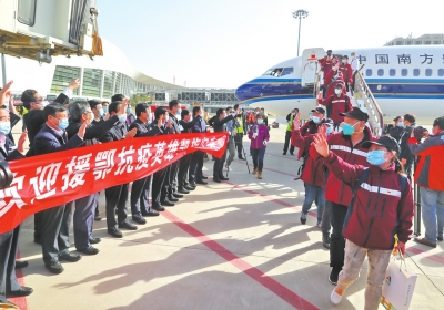 經(jīng)一個多月的艱苦奮戰(zhàn),453名健康勇士圓滿出色地完成了援助工作任務(wù),平平安安、載譽歸來!省衛(wèi)生健康委闞全程主任等領(lǐng)導(dǎo)到機場迎接,并轉(zhuǎn)達省委書記王國生、省長尹弘的親切慰問。