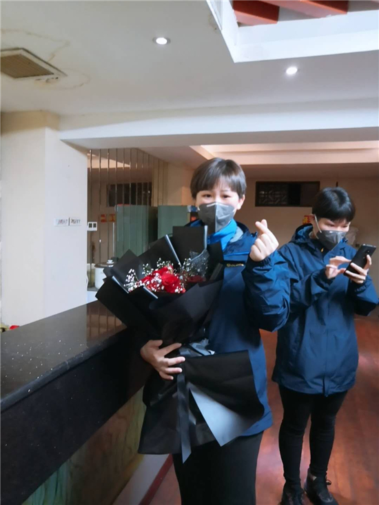 隊(duì)伍集合完畢,接下來的一幕令許聽聽始料未及。來自當(dāng)?shù)厣鐓^(qū)的工作人員,手捧蛋糕、鮮花,唱著生日歌,來到許聽聽面前,向她致以生日祝福。特殊時(shí)期,身處抗疫一線,忙于照顧病人,許聽聽此前對(duì)自己的23歲生日沒有任何憧憬,她告訴記者,其實(shí)她當(dāng)天沒想起來是她的生日,面對(duì)突如其來的生日祝福,許聽聽說:“當(dāng)時(shí)的心情既激動(dòng)又感動(dòng)。”。