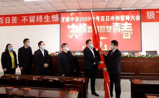 誓師大會(huì)現(xiàn)場(chǎng),才源中學(xué)校長(zhǎng)張醒民向九年級(jí)階段負(fù)責(zé)人授戰(zhàn)旗。師生代表面對(duì)直播鏡頭向全體初三師生發(fā)出鏗鏘誓言,號(hào)召大家奮勇爭(zhēng)雄,2020年再奪中考全市領(lǐng)先的佳績(jī)。誓詞為:凌志擎天,豪氣滿懷;天道酬勤,樂(lè)戰(zhàn)不怠;意堅(jiān)心恒,信念常在;以我雄心,征戰(zhàn)未來(lái);沖刺百日,只為無(wú)悔青春;人生綻放,定是風(fēng)雨兼程;今日苦讀書厲兵秣馬,明朝進(jìn)重點(diǎn)吐氣揚(yáng)眉。