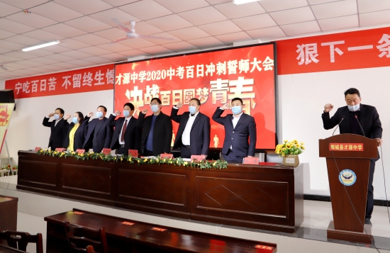 破釜沉舟、萬(wàn)千學(xué)子爭(zhēng)咫尺;臥薪嘗膽、龍門陣?yán)锟喟绢^。全力以赴、用勤奮改變?nèi)松?;永不言改、以?zhí)著成就未來(lái)……3月22日,鄲城縣才源中學(xué)組織60名師生在學(xué)校主會(huì)場(chǎng),以視頻直播“隔空對(duì)話、隔屏傳情”的方式,和全校三年級(jí)師生一起開展中考百日誓師大會(huì)。